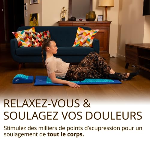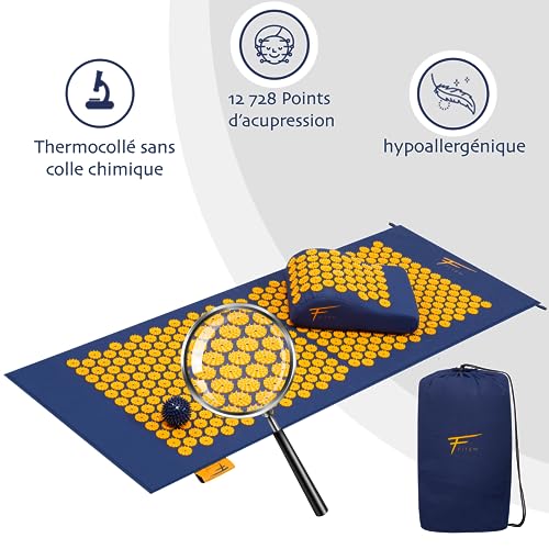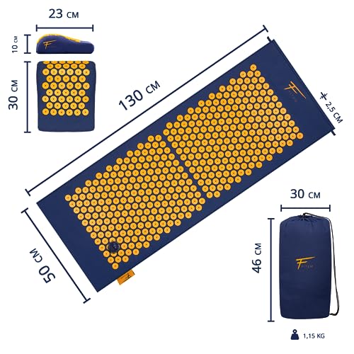 Kit d’acupression XL Fitem – Tapis d’Acupression – Coussin – Boule de Massage – Soulage douleurs Dos et Cou – Sciatique – Massage dos – Relaxation Musculaire – anti stress. (Bleu-Orange)