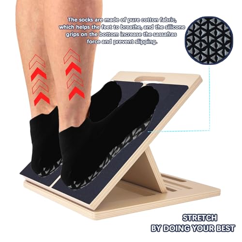 Conception Triplement Antidérapante Et Stable: Étireur de mollets avec poignée 46 x 40,5 x 32 cm, surface texturée papier de verre, 4 patins antidérapants en caoutchouc et 2 paires de chaussettes antidérapantes en coton pour une triple protection. Sa structure triangulaire stable assure une utilisation stable sur tous types de sols.