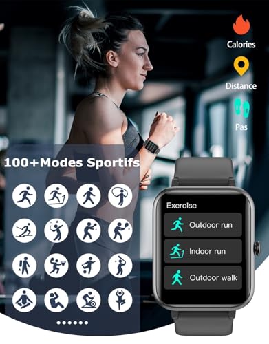 🌈 Tracker d’Activité avec 9 Modes Sportifs : Marche, vélo, randonnée, escalade, fitness, vélo d’appartement, tapis roulant, course à pied, yoga. Vous pouvez choisir 8 modes sportifs à afficher sur la montre de sport et consulter les statistiques en temps réel à tout moment pendant l’exercice.